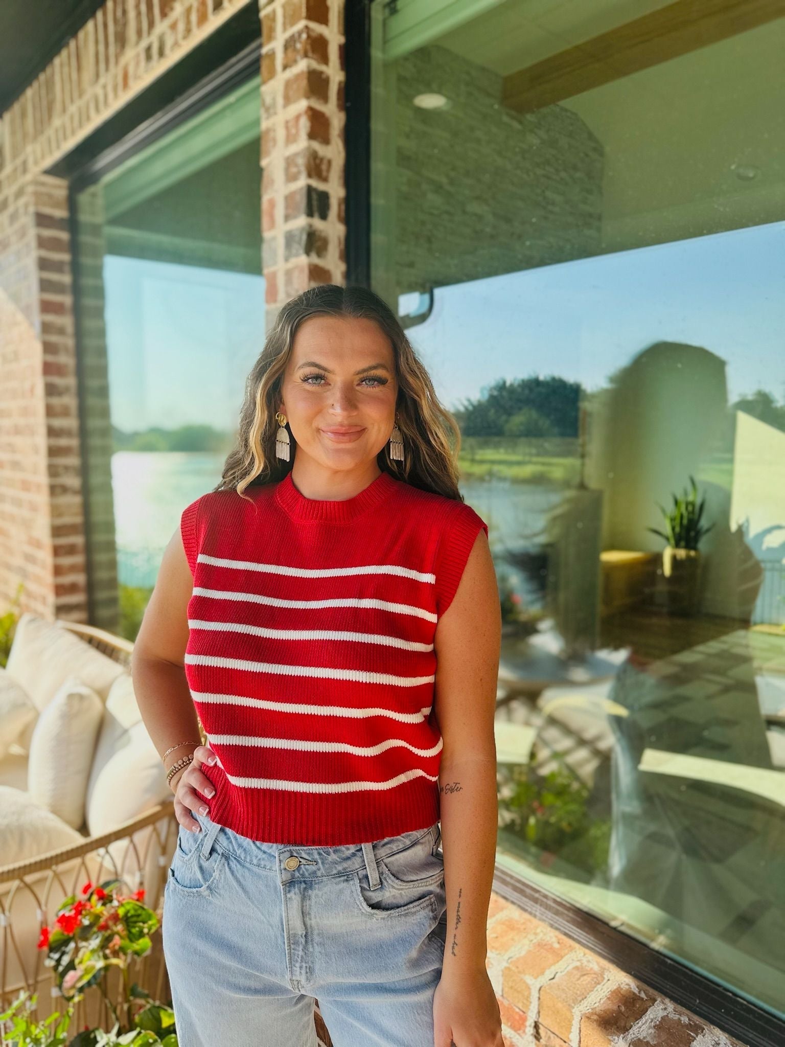 The perfect transitional piece for breezy summer nights and layered fall looks. This red and cream striped sleeveless sweater is crafted with a breathable cotton blend for softness and structure. Whether worn solo or layered under your favorite jacket, this versatile piece adds effortless style to your everyday wardrobe.