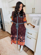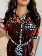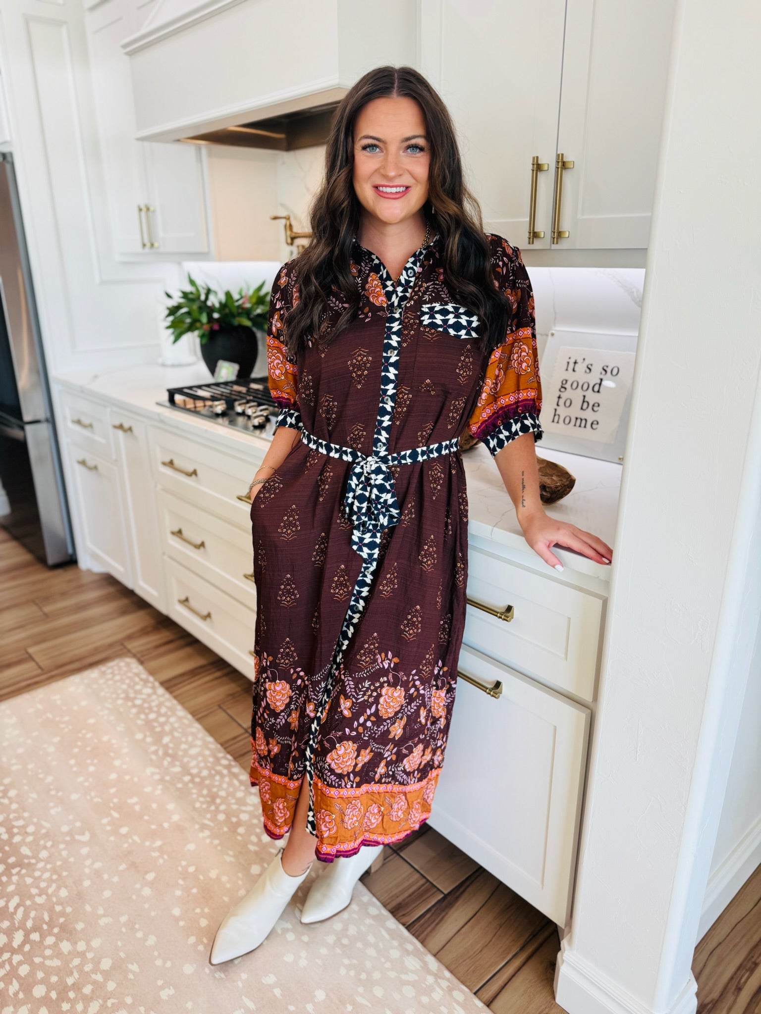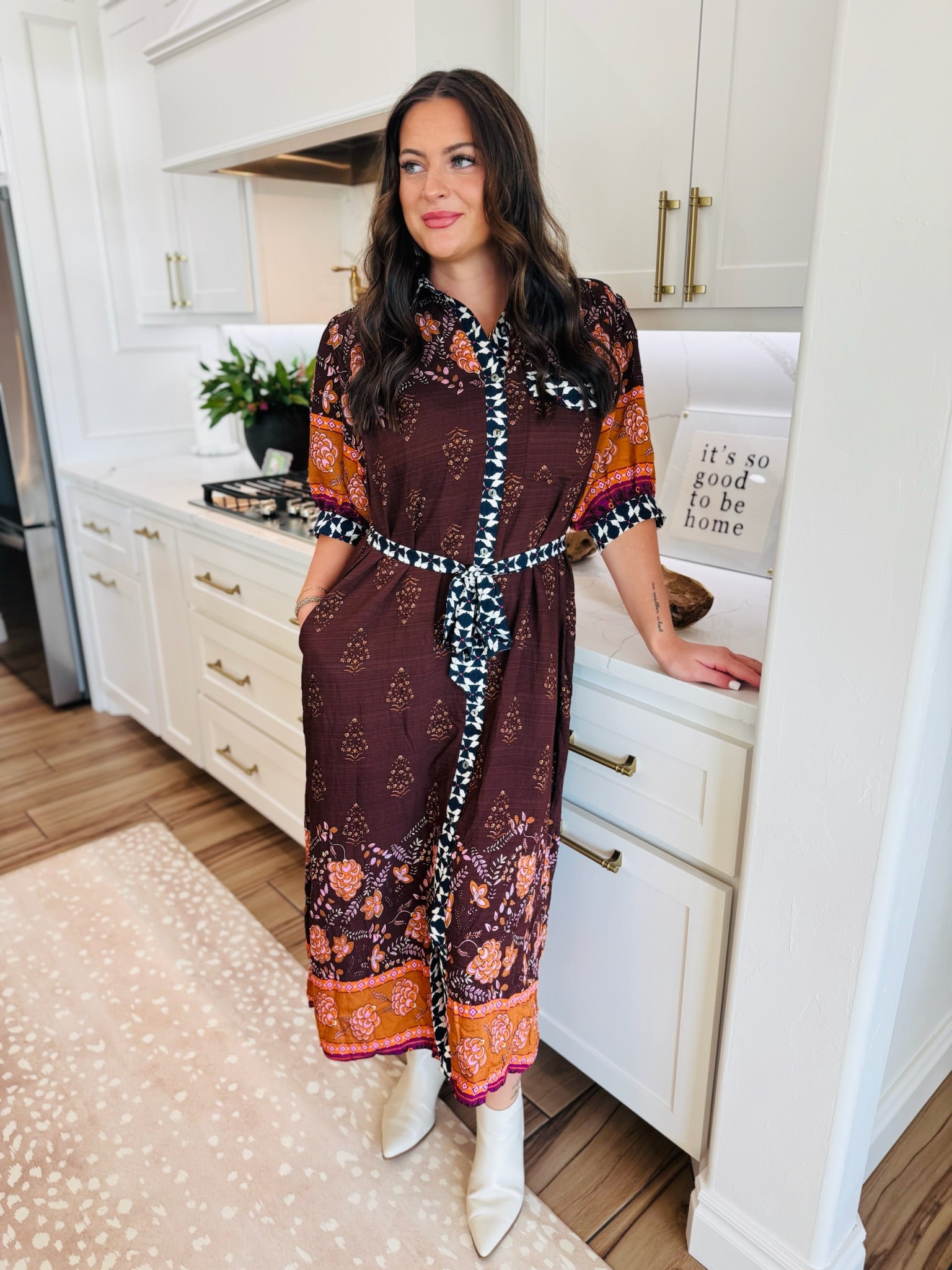 Effortless charm meets timeless design in this Brown Floral Hem Maxi Dress by Entro. Crafted with elegant flow and feminine detail, this piece features a soft brown base accented by floral embroidery along the hemline, creating a perfect blend of earthy warmth and delicate sophistication. Designed for versatility, it transitions seamlessly from brunch dates to evening gatherings. Button down with navy trim details make this dress stand out from others.