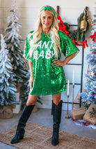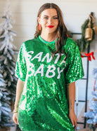 Shine bright this holiday season in the Santa Baby Green Sequin Oversized Holiday Dress! Featuring dazzling all-over green sequins and a relaxed, oversized fit, this festive dress is the perfect show-stopping look for Christmas parties, girls’ night out, or any holiday celebration. Its cozy lining ensures comfort while the shimmering sequins catch the light from every angle. Dress it up with heels or keep it casual with tall boots for a merry, effortless vibe.