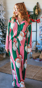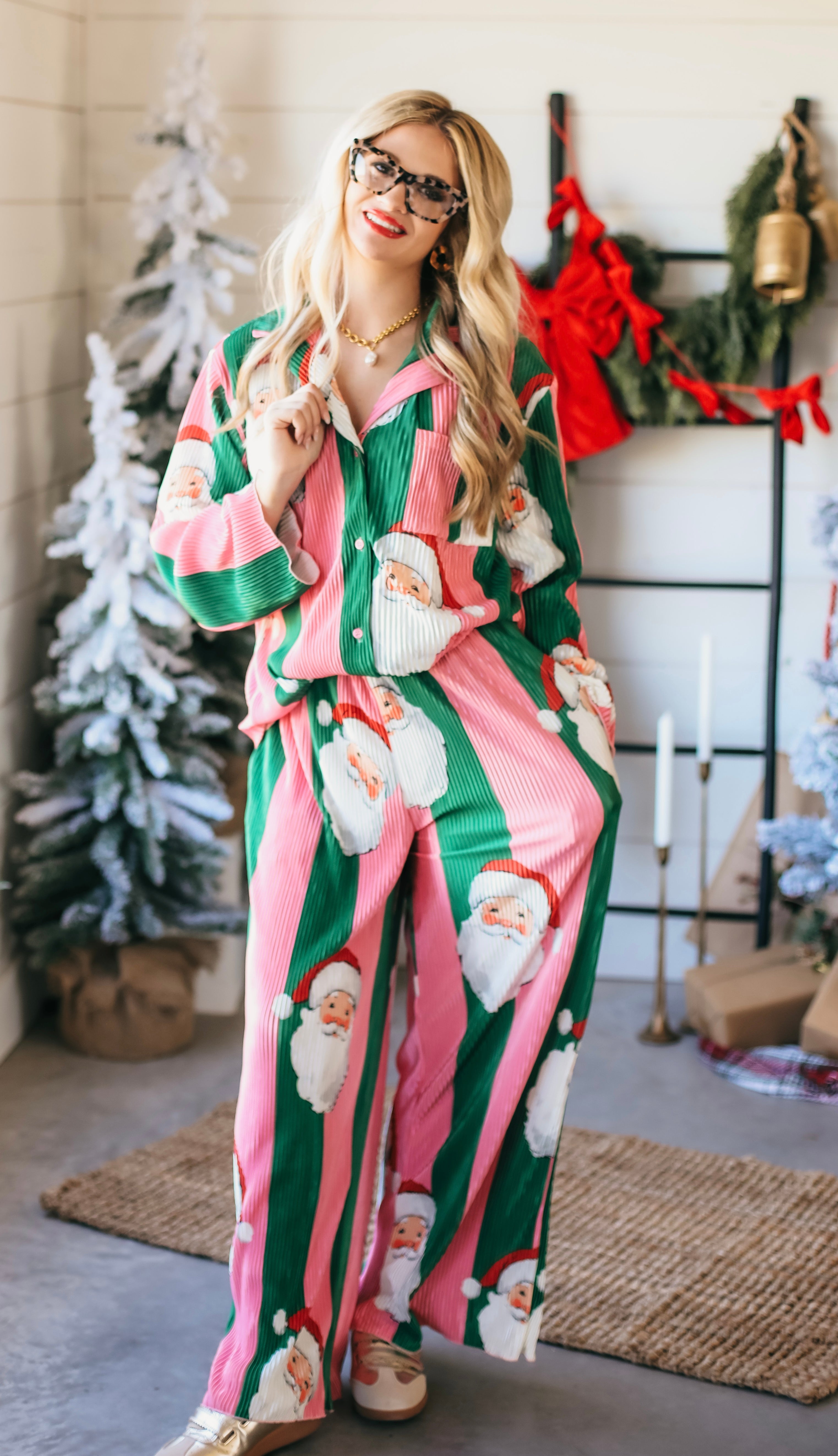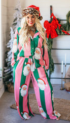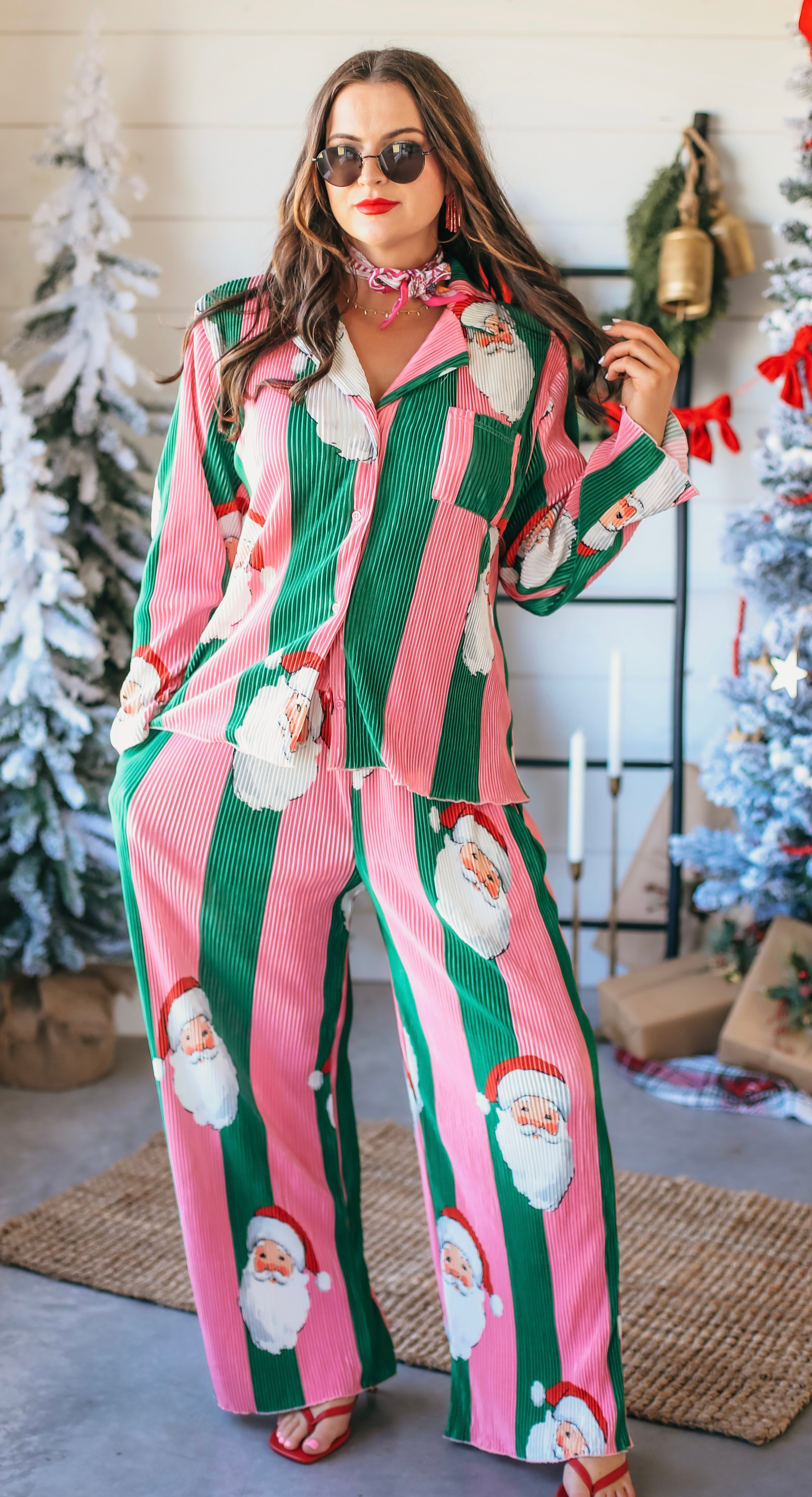 Celebrate the holidays in style with our Peach Love Stripe Santa Printed Pajama Pant Set! This cozy two-piece set features a playful pink and green striped design with an adorable Santa print that brings festive cheer to your loungewear. Crafted from ultra-soft, breathable fabric, it’s perfect for Christmas morning photos, cozy nights by the fire, or gifting to someone special.