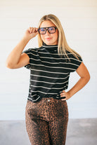 Elevated basics never go out of style. This Black and Cream Stripe Mock Neck Turtleneck by Entro brings modern sophistication to your wardrobe. Designed with a soft, structured silhouette, chic mock neckline, and feminine cap sleeves, it’s the perfect versatile staple. Style it alone for a minimalist look or layer under blazers, cardigans, or denim jackets for a polished finish.