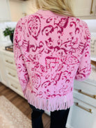 Wrap yourself in effortless style with the FATE Jacquard Patterned Pink Cardigan — a statement layering piece designed for comfort and charm. Featuring a stunning woven jacquard pattern in soft blush tones, this cardigan brings texture and warmth to any outfit. The fringed hem detail adds a touch of boho sophistication, making it perfect for cozy weekends, brunch dates, or layering over your favorite boutique denim and boots.