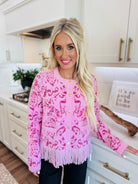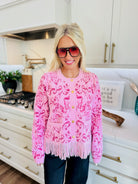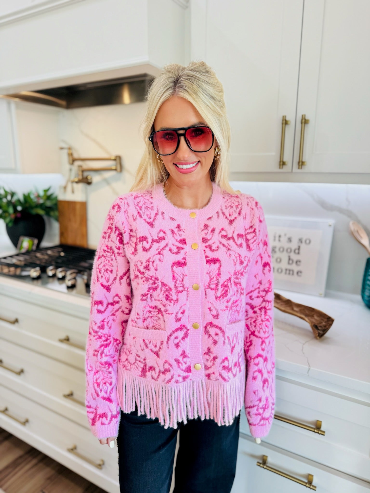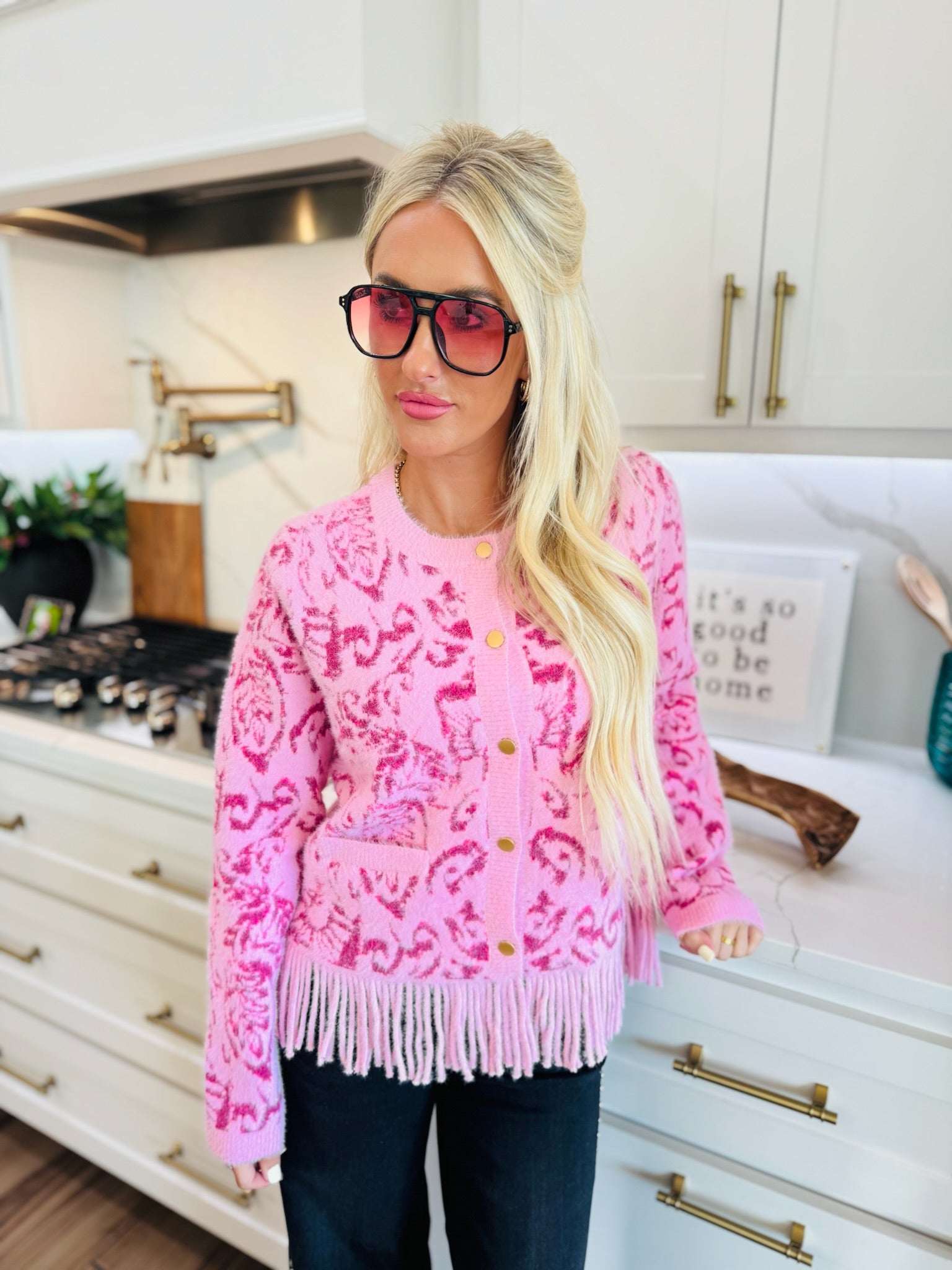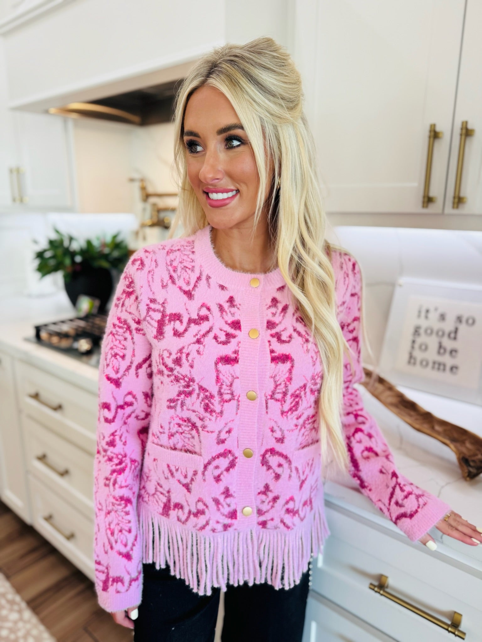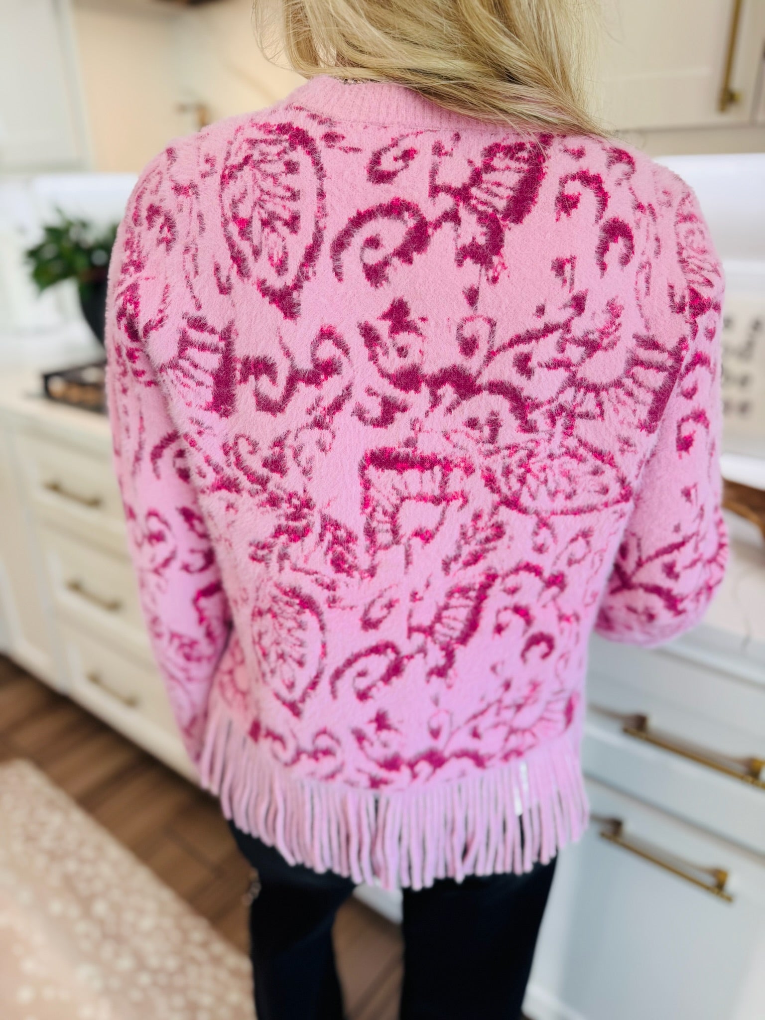 FATE JACQUARD PATTERNED PINK CARDIGAN WITH FRINGE HEM
