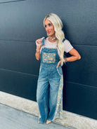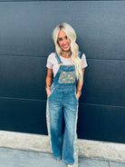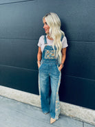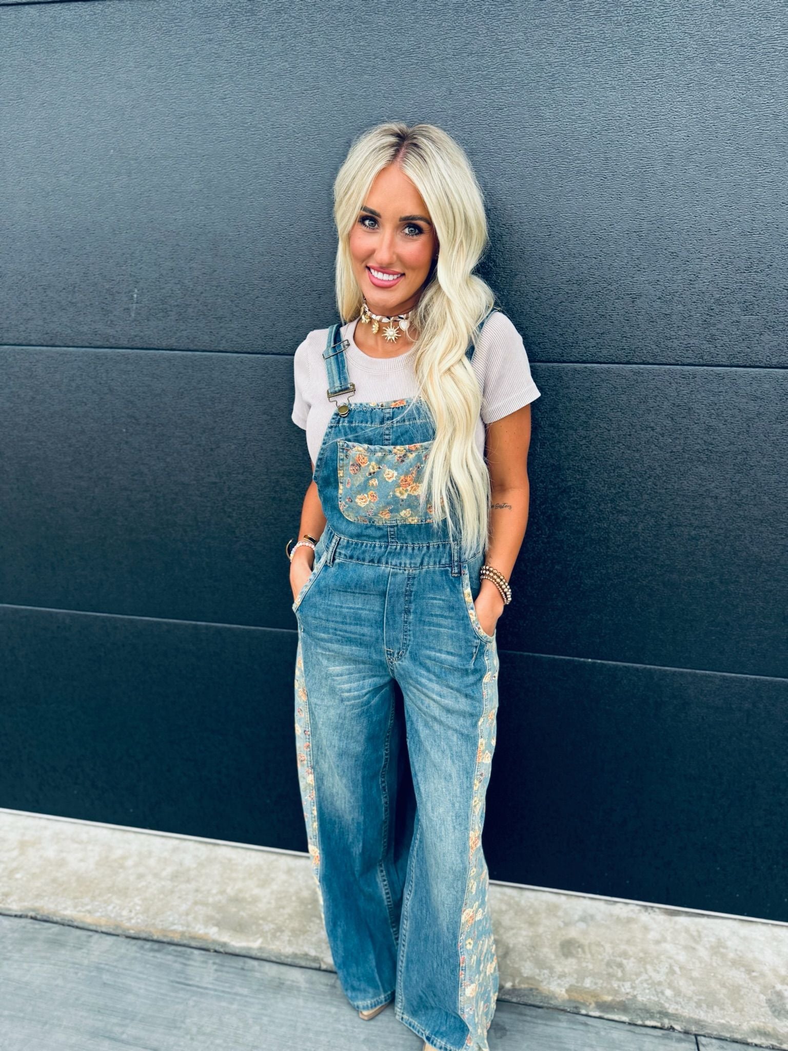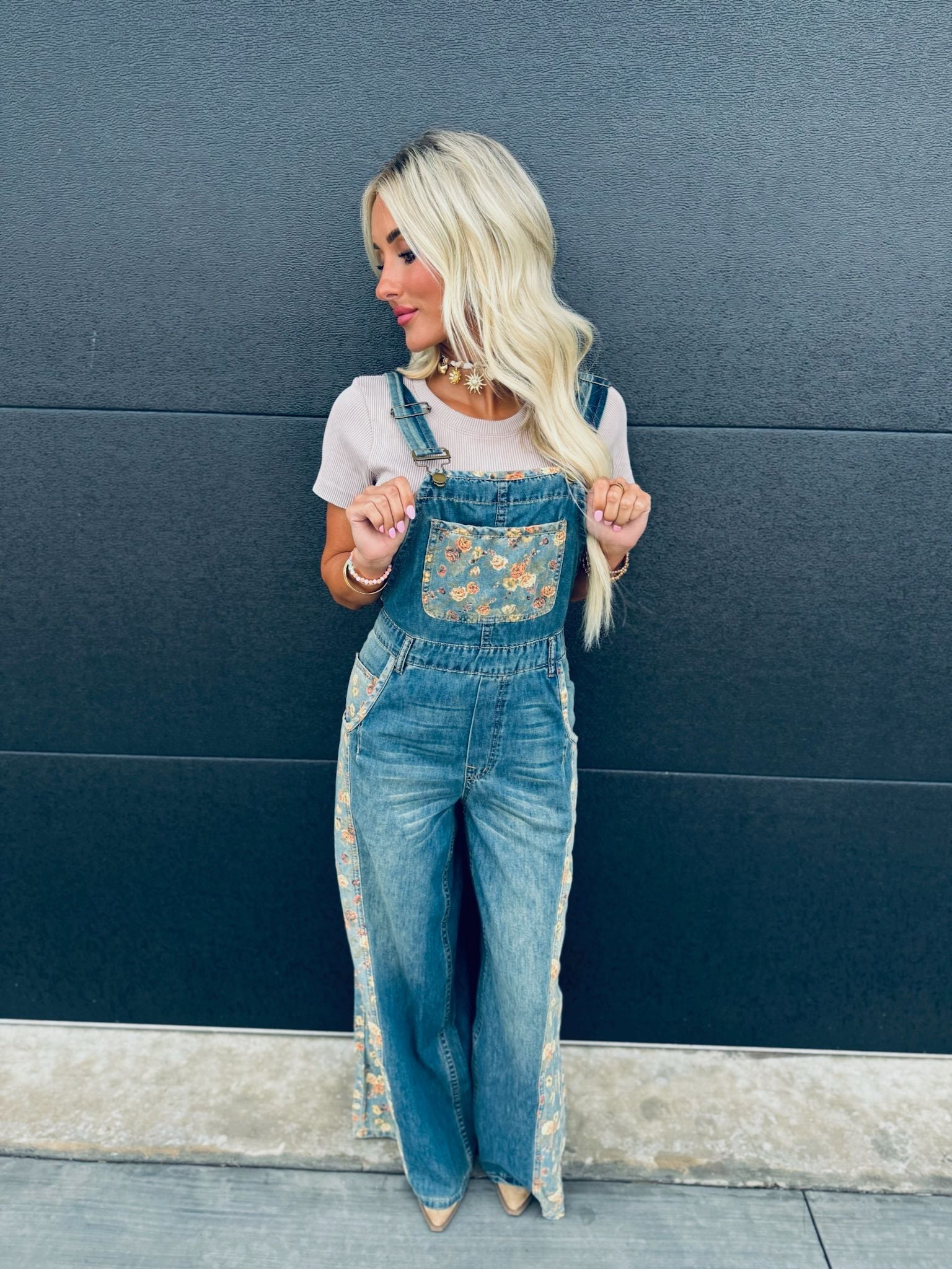 WOMEN'S FLORAL CONTRAST DENIM WIDE LEG OVERALLS- SOFT CLASSIC FALL OUTFIT