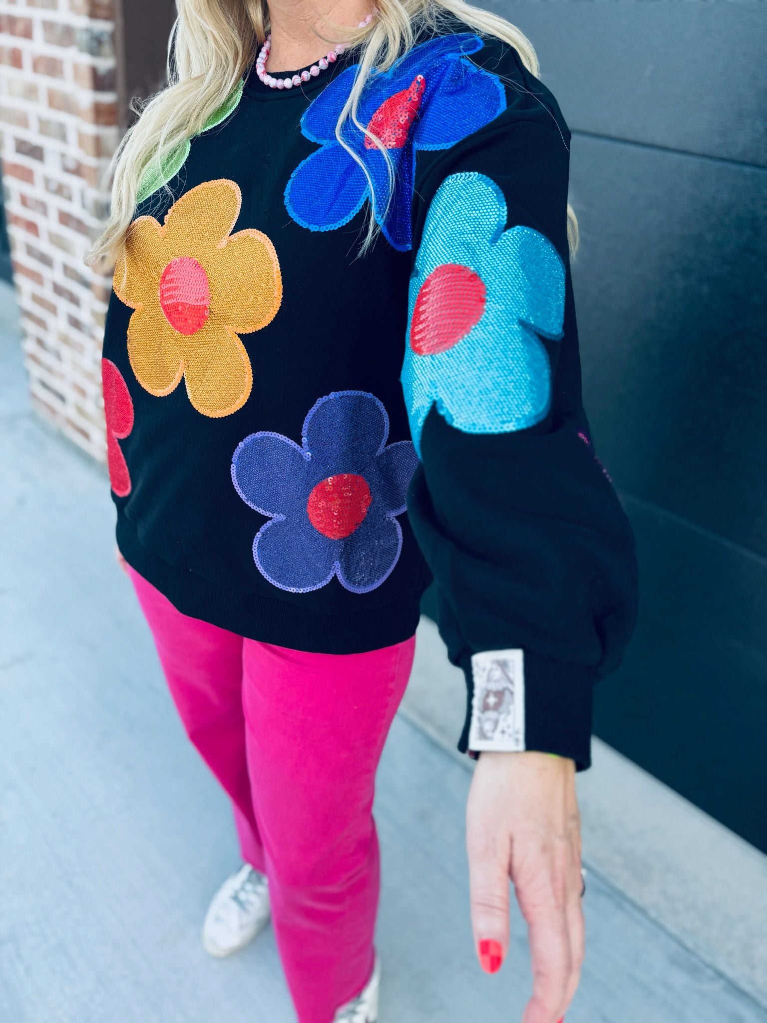 QUEEN OF SPARKLES BLACK MULTI OVERSIZED RHINESTONE FLOWER SWEATSHIRT