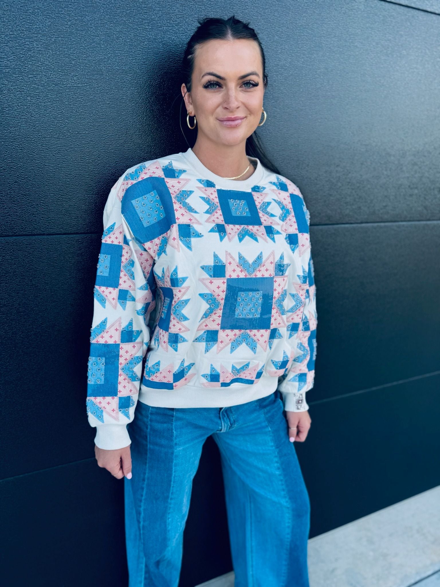 QUEEN OF SPARKLES IVORY, BLUE & LIGHT PINK PATCHWORK SWEATSHIRT
