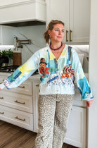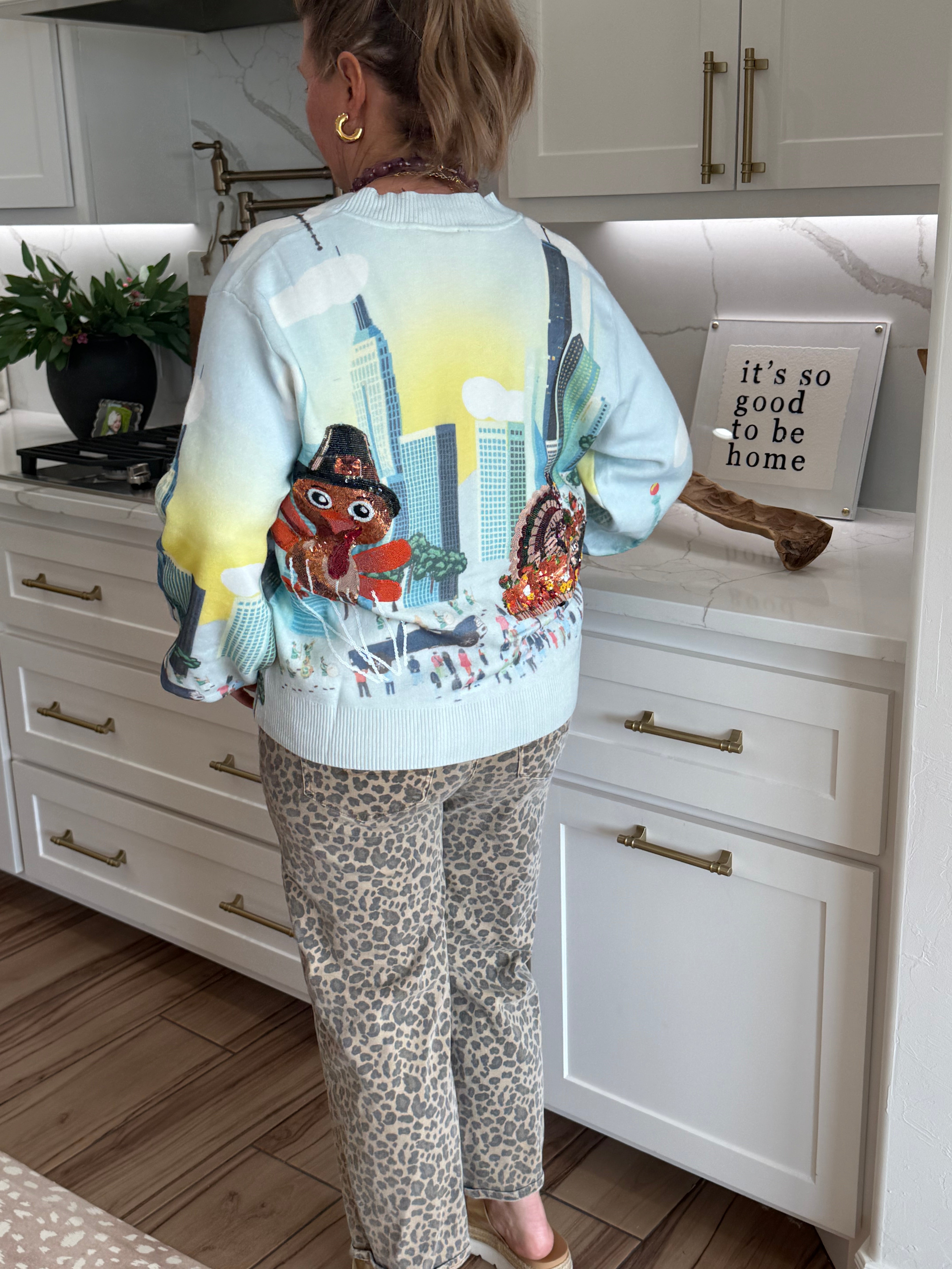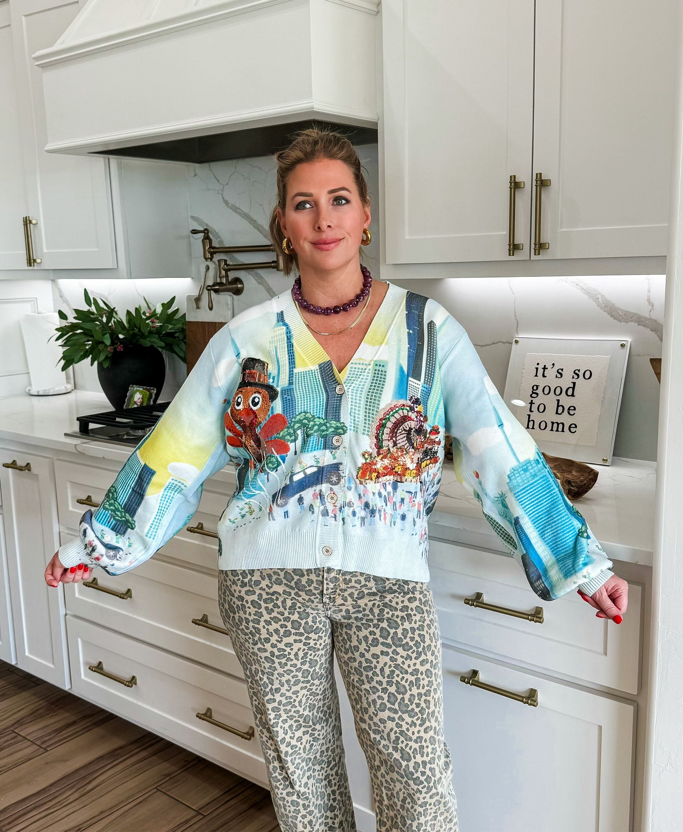 Celebrate one of America’s most iconic traditions with this Queen of Sparkles Macy’s Day Parade Cardigan — a statement piece that blends festive spirit with signature sparkle. Featuring playful embroidered details of the famous turkey float, Statue of Liberty, and dazzling gold rhinestone buttons, this cardigan captures the joy and nostalgia of the holiday season.