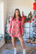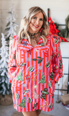 The Queen Of Sparkles Pink & Red Stripe Christmas Icon Collar Dress features a relaxed fit with a collared neckline, long sleeves, and a mini length. Designed in candy cane–inspired stripes and sprinkled with glittering Christmas icons, it’s a bold yet cozy holiday statement. Perfect for parties, photos, or any festive occasion—style it with boots for a chic seasonal look or sneakers for playful everyday wear.