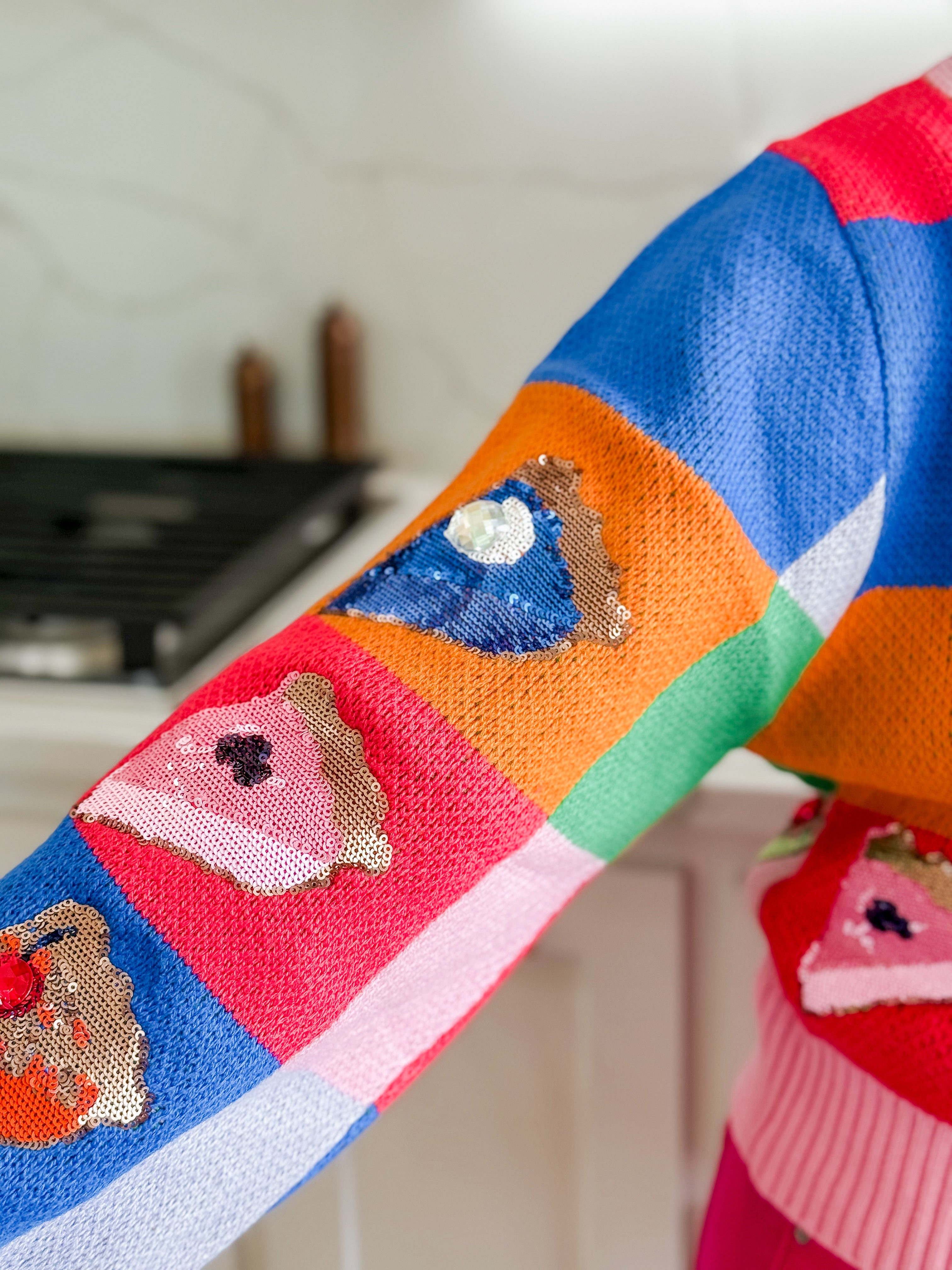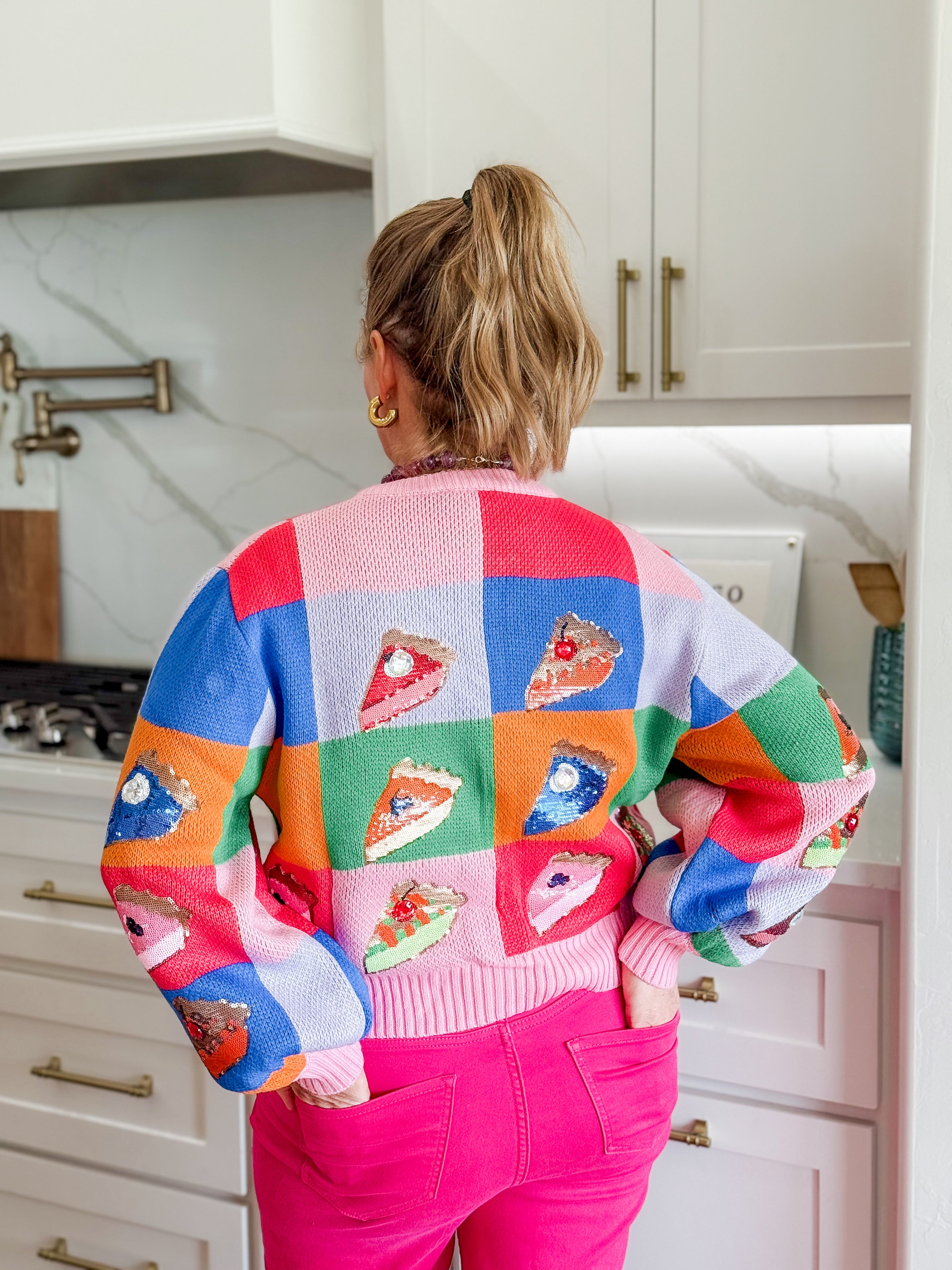Made from a soft, cozy knit, this cardigan pairs beautifully with fun colorful pants, classic denim, or a flirty skirt. Whether you’re hosting a gathering or just want to be the life of the pie party, this statement sweater is your go-to for comfort, confidence, and cheer.