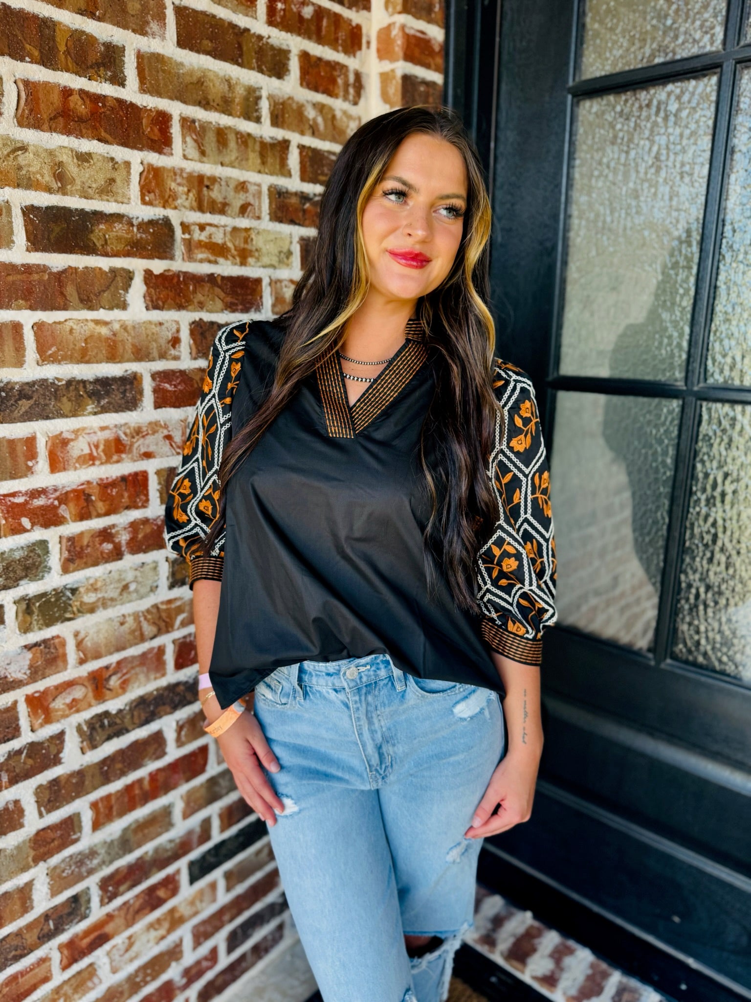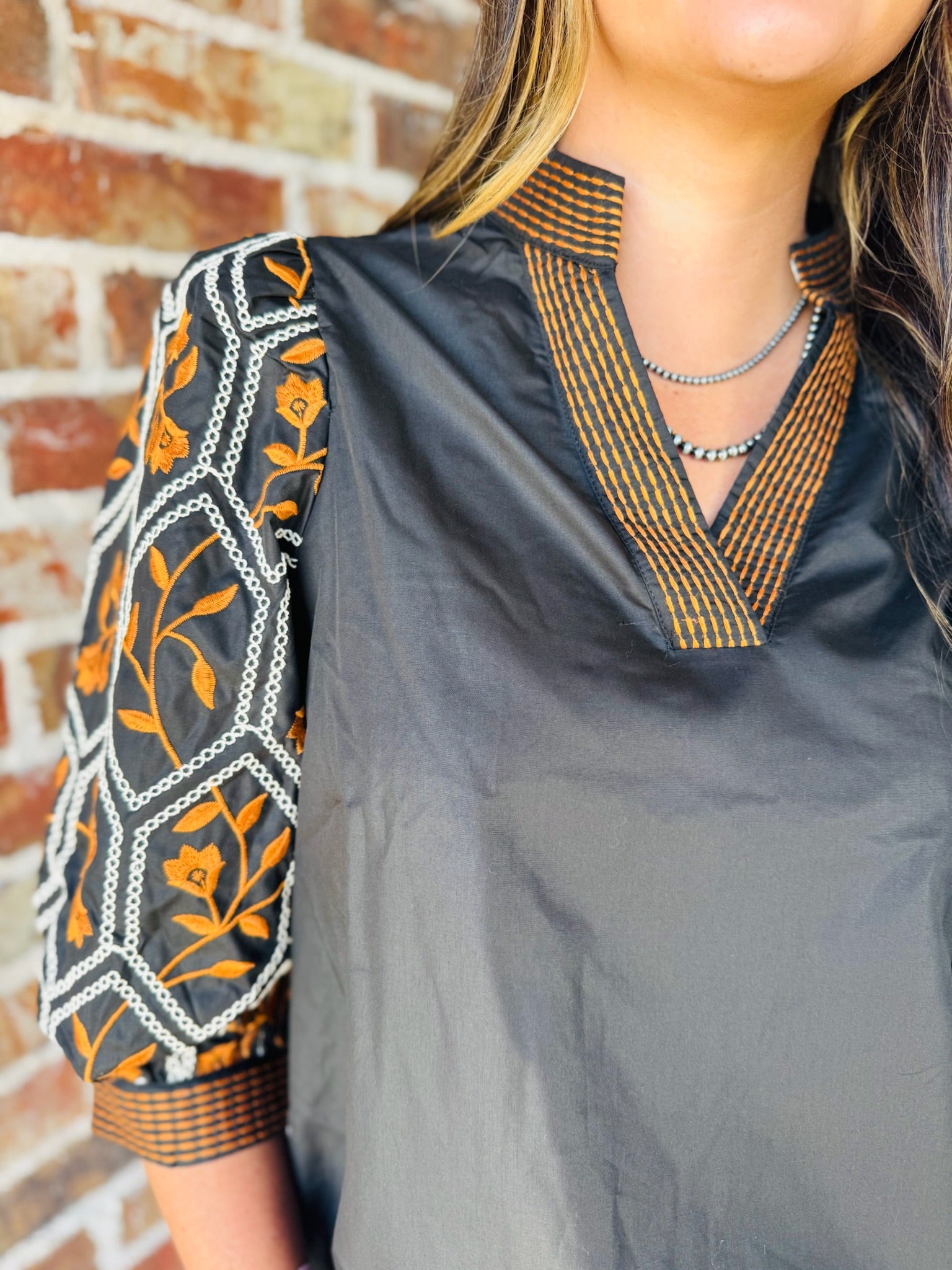 Step into fall with confidence and flair in this embroidered black top, designed to keep you stylish from October festivities to everyday outings.
