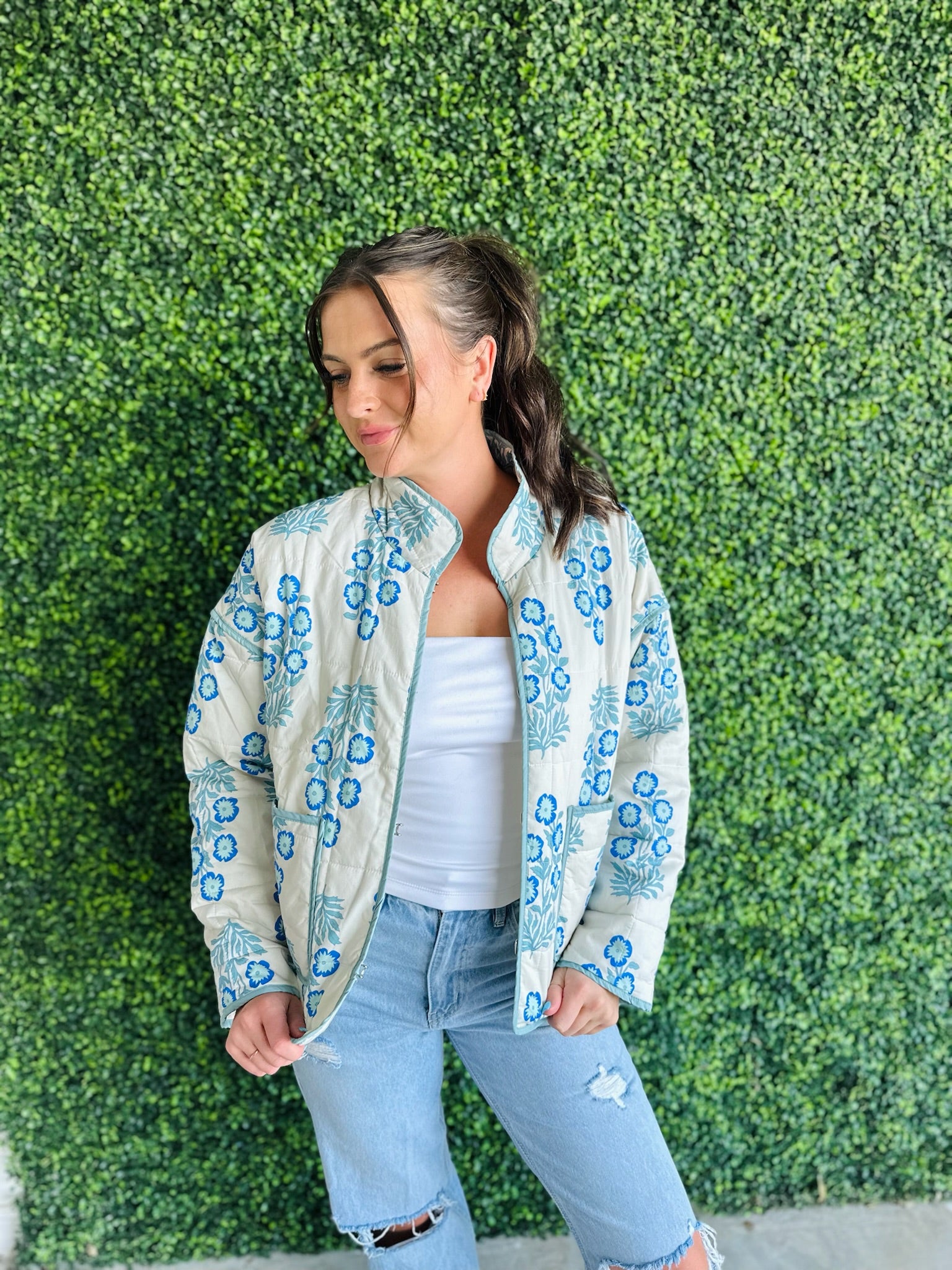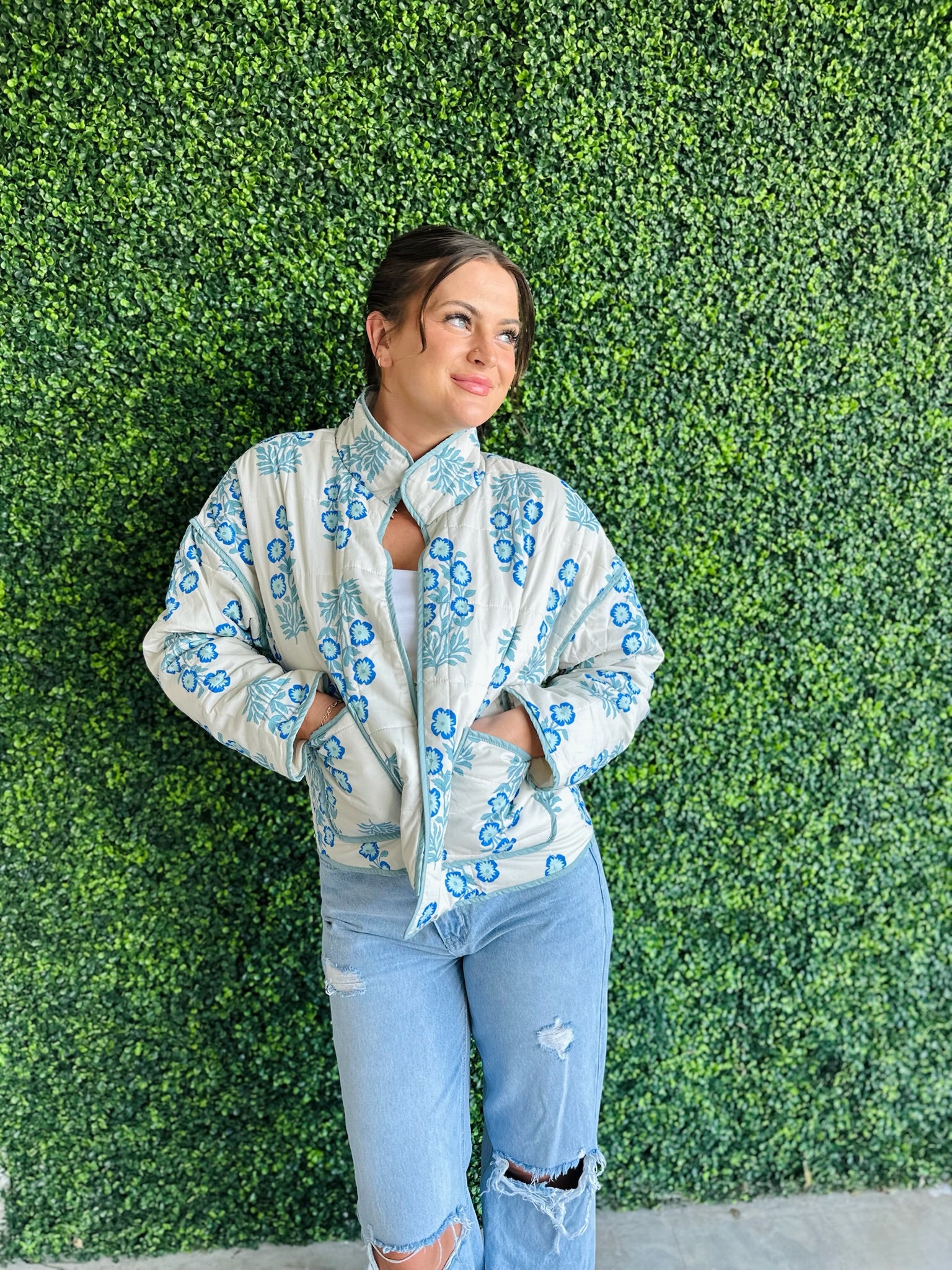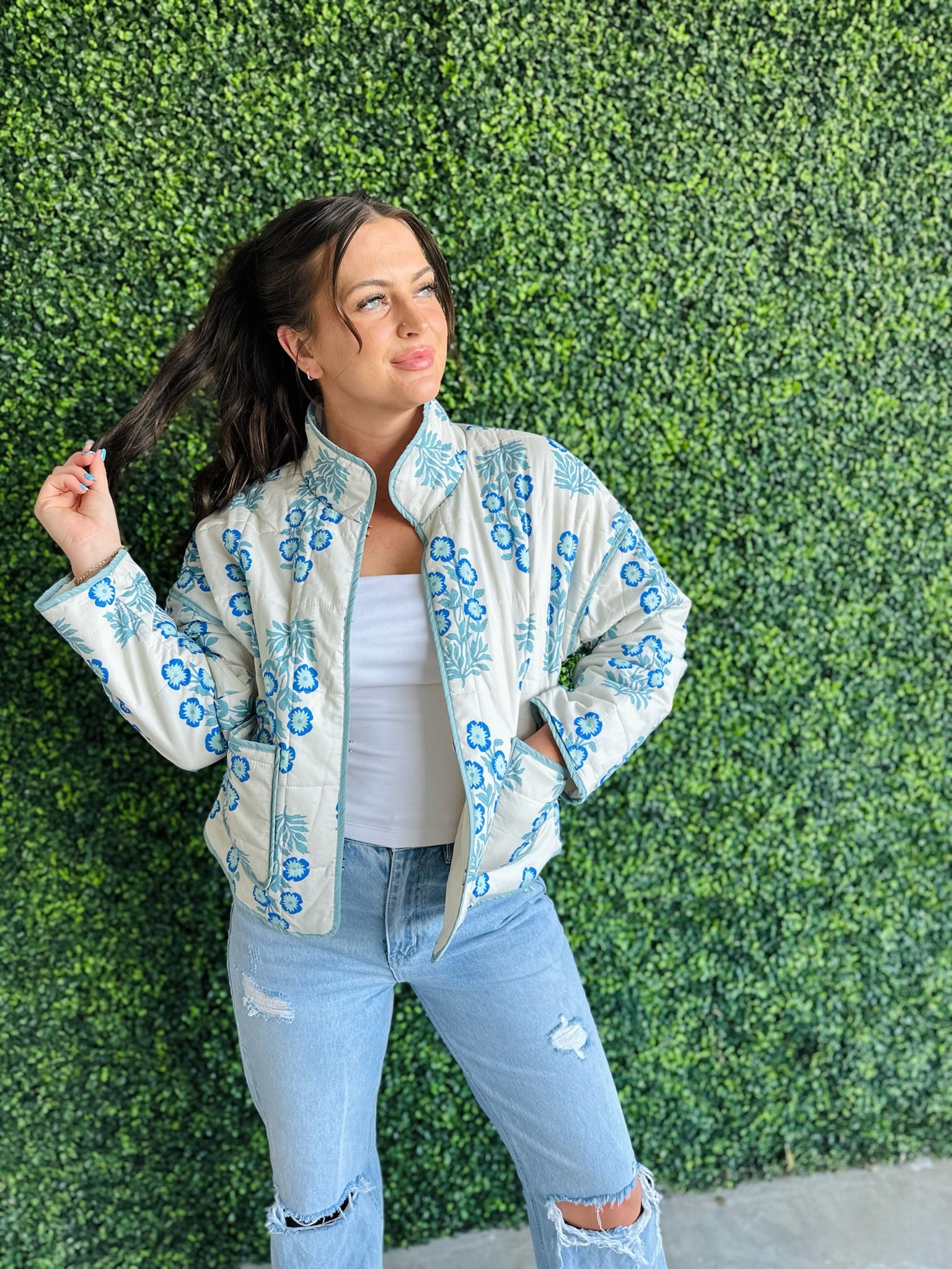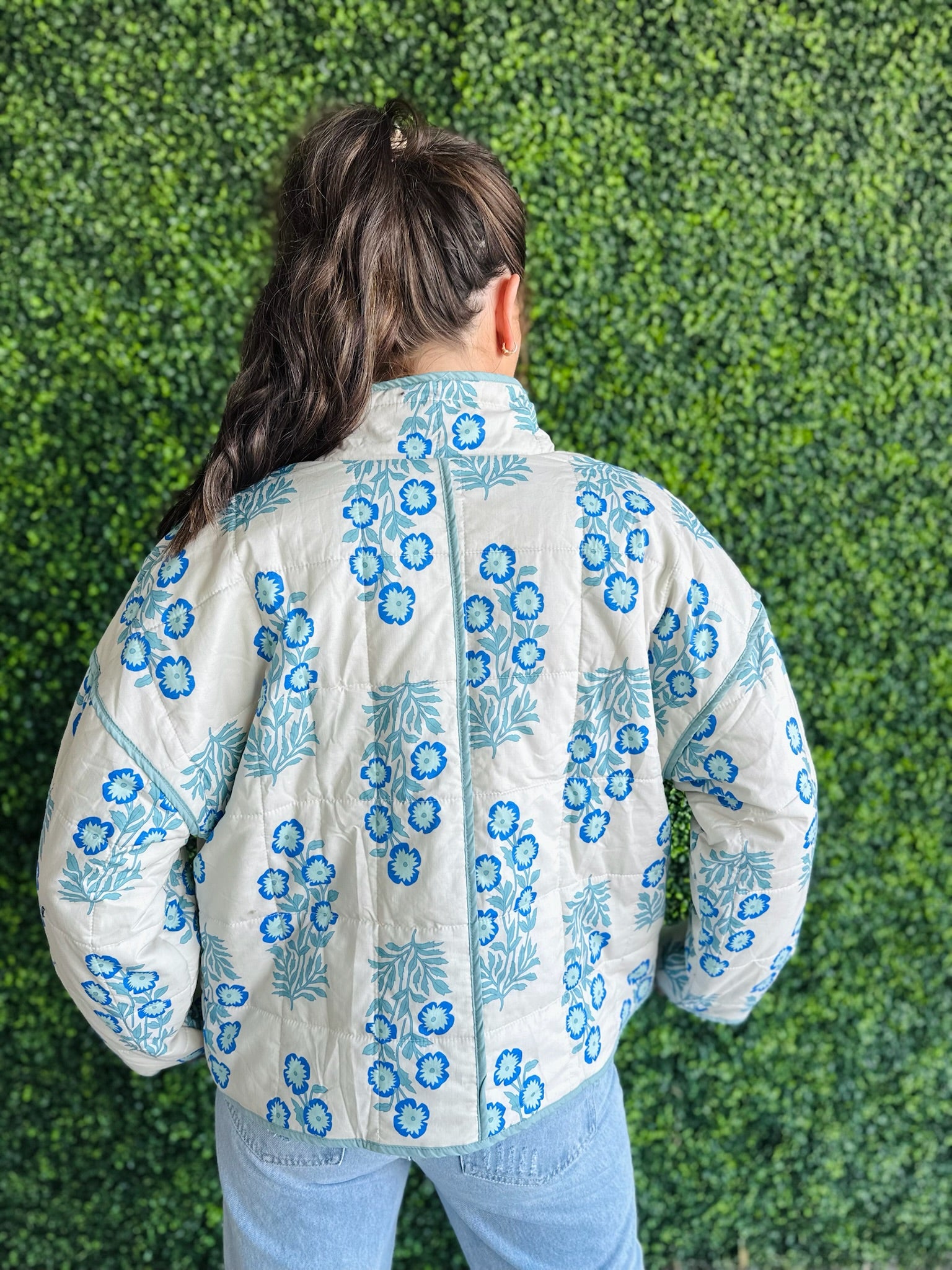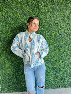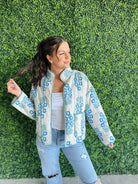 Bring classic floral beauty into your wardrobe with this cream and blue quilted jacket—your new go-to for cozy, confident style.