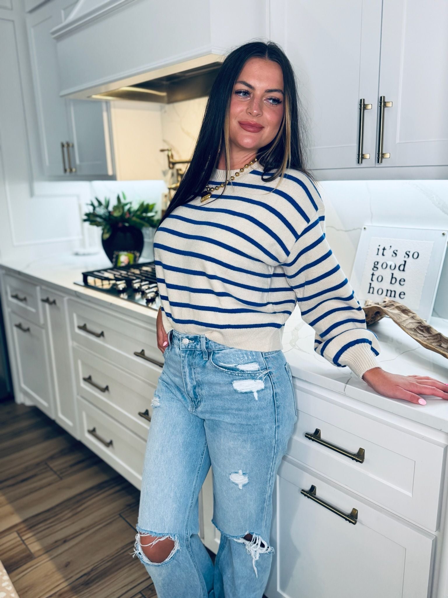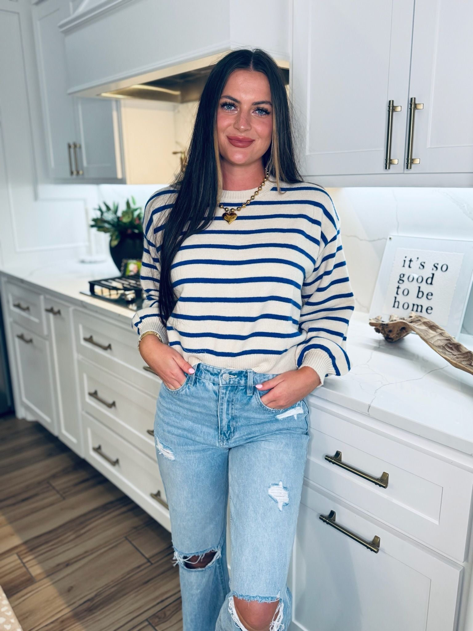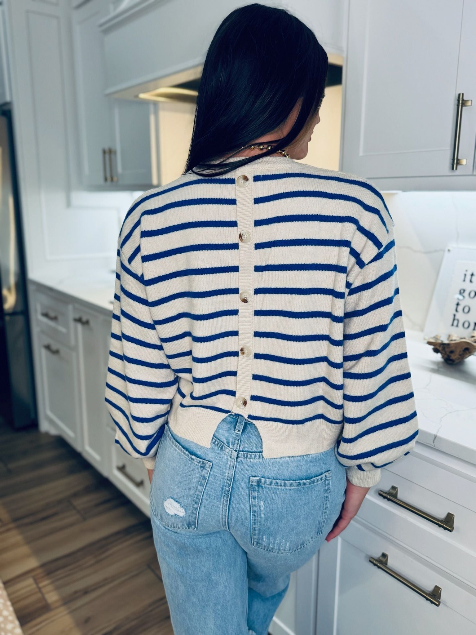 Stay cozy in elevated style with this cream and cobalt knit sweater from Double Zero. Crafted in a soft, textured knit, this sweater features an easy, relaxed fit that blends comfort with chic everyday wear. The fresh cream base with bold cobalt accents adds a pop of color that feels timeless yet on-trend, while buttons down the back provide extra flair.