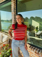 The perfect transitional piece for breezy summer nights and layered fall looks. This red and cream striped sleeveless sweater is crafted with a breathable cotton blend for softness and structure. Whether worn solo or layered under your favorite jacket, this versatile piece adds effortless style to your everyday wardrobe.