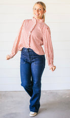 Elevate your everyday style with this Striped Ruffled Button-Down Top. Designed with feminine details and a timeless silhouette, this blouse is perfect for both casual and dressy occasions. The high ruffled neckline and button-down placket with ruffle trim add charm, while the relaxed fit ensures effortless comfort. Long puff sleeves with ruffled buttoned cuffs complete the look with a touch of elegance.