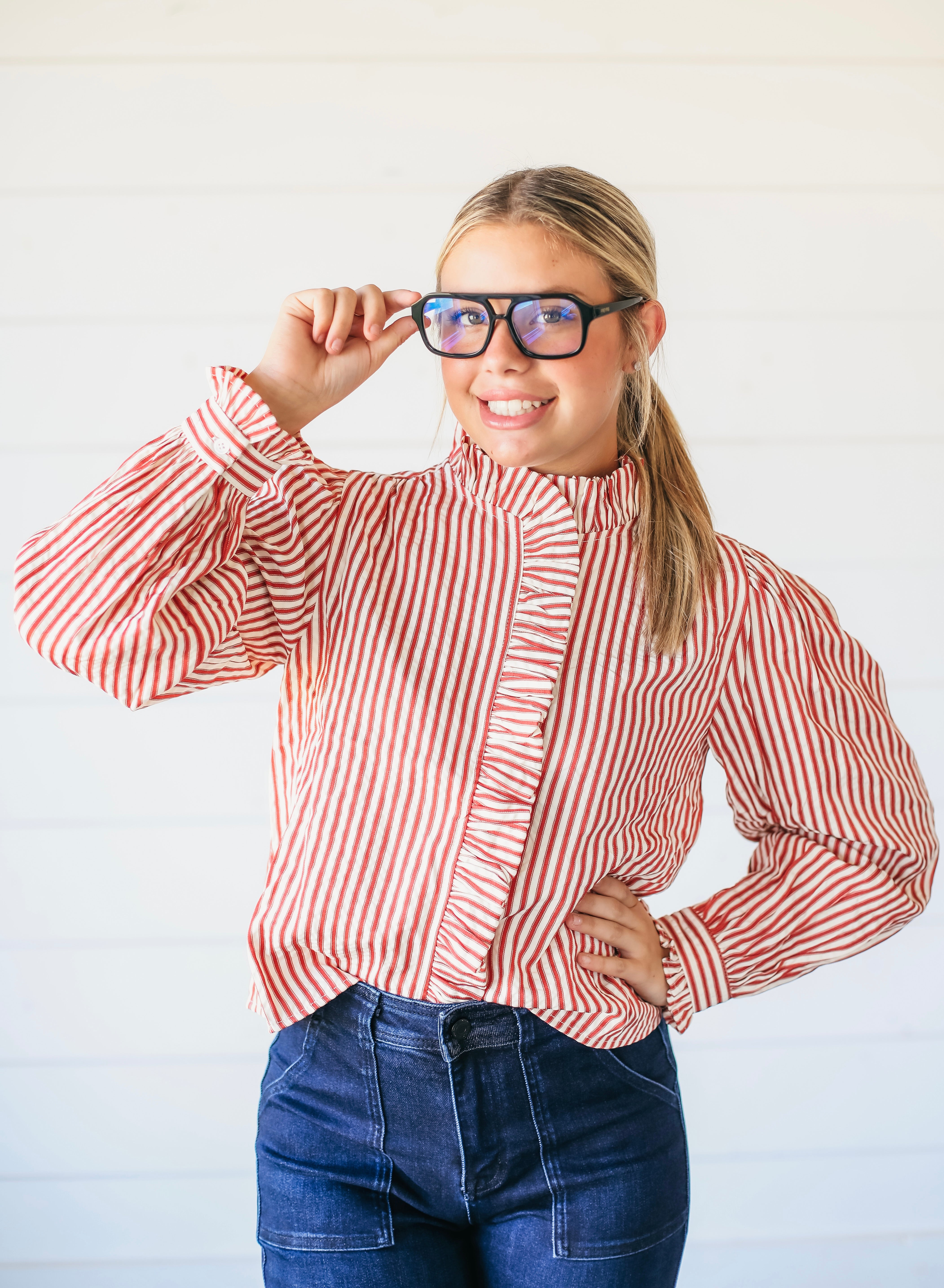 RED STRIPED RUFFLED BUTTON DOWN TOP