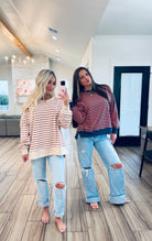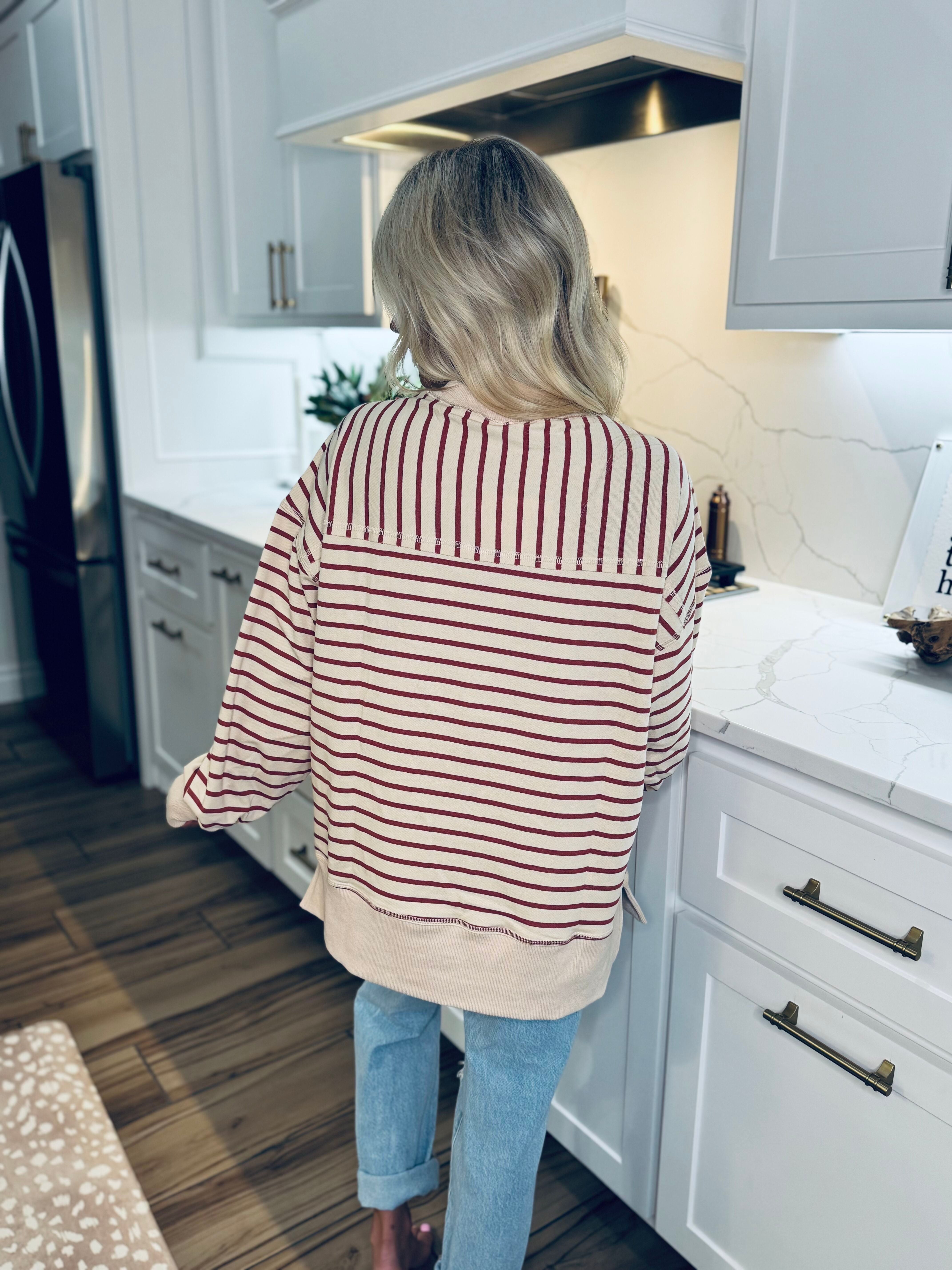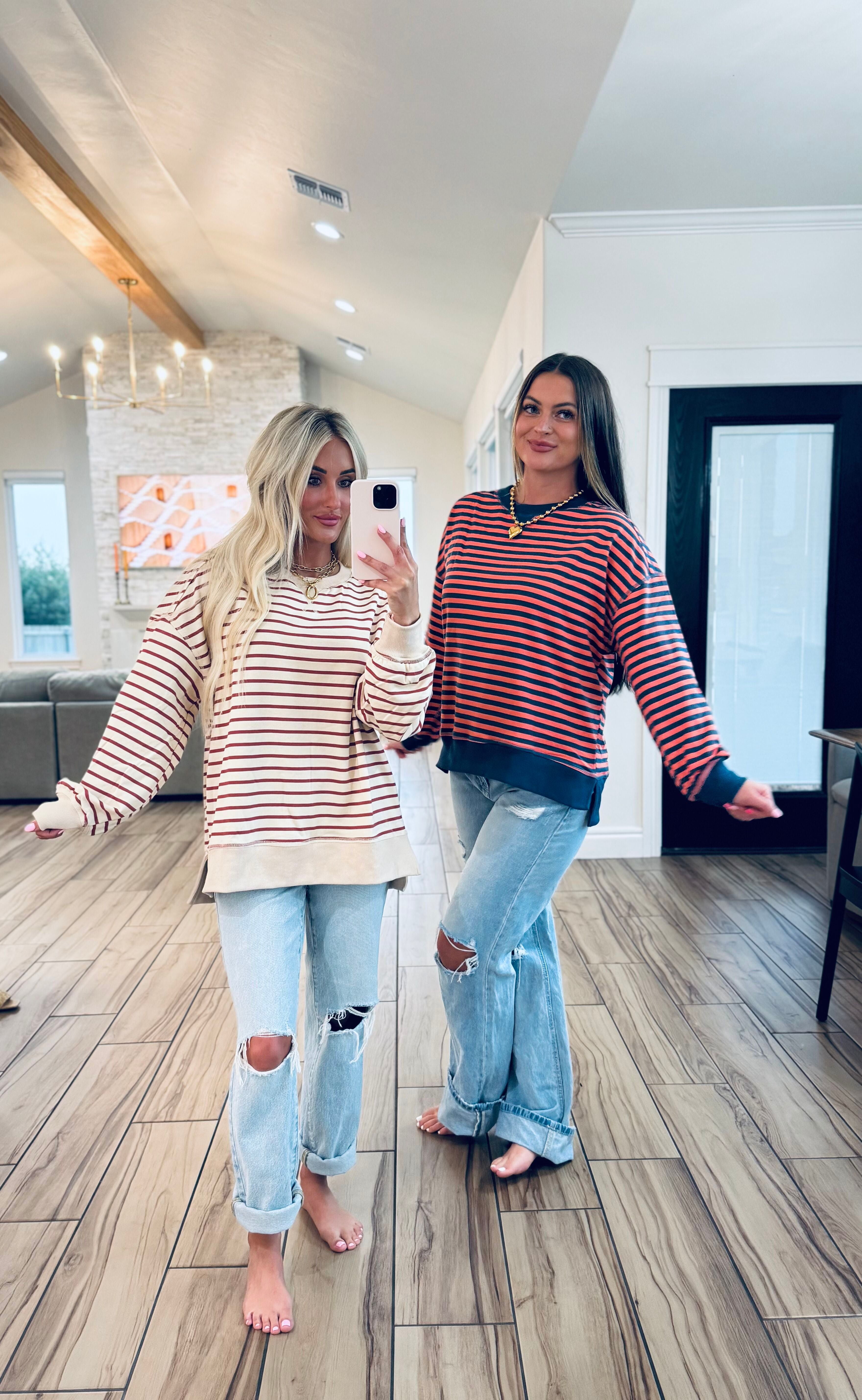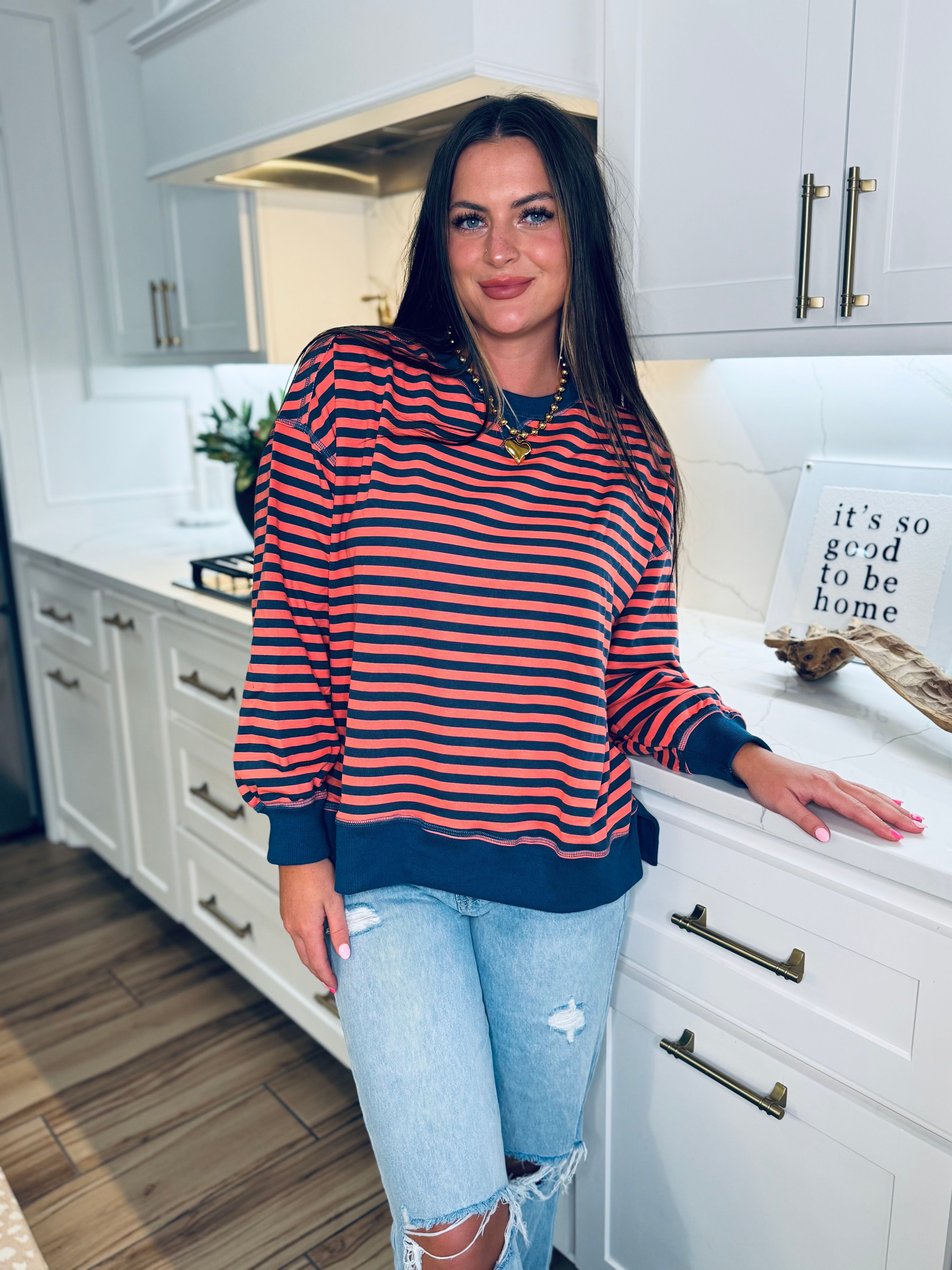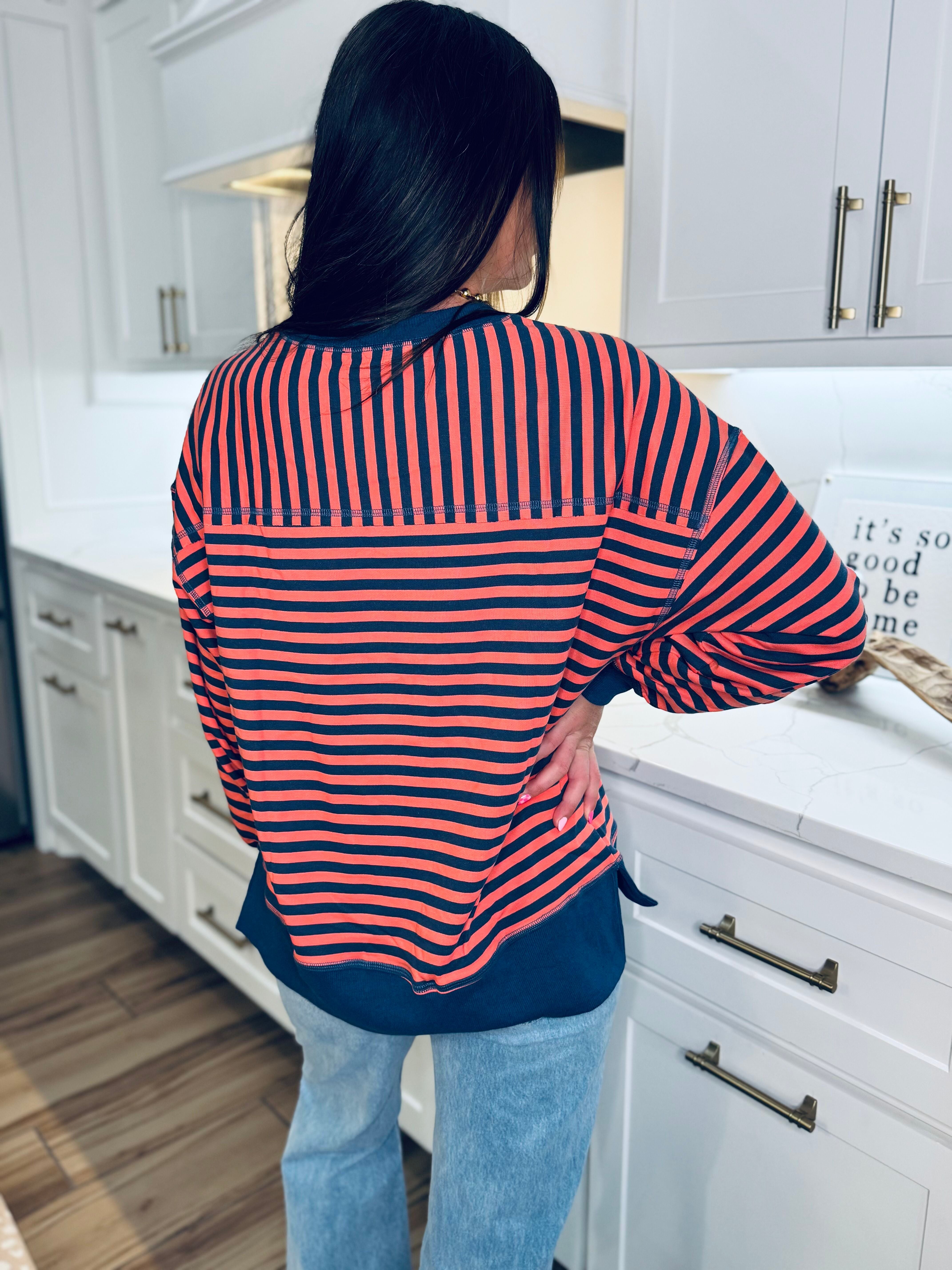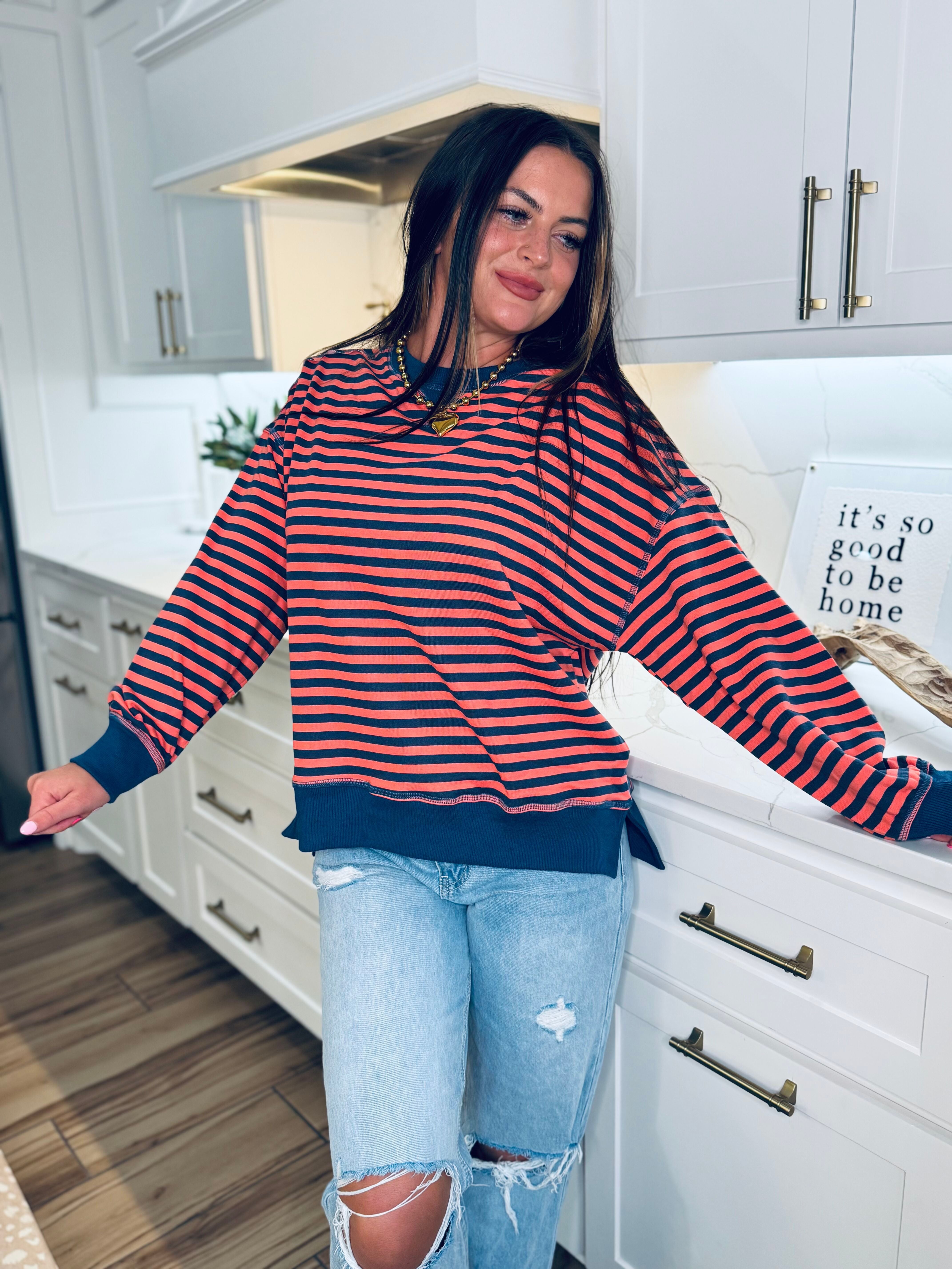 Effortlessly chic and endlessly comfortable, this oversized knit shirt features a classic long sleeve silhouette with modern coral and navy stripes. Designed in a relaxed fit, it drapes beautifully for that laid-back, on-trend look while keeping you cozy through cooler days. The soft knit texture makes it perfect for pairing with denim, leggings, or layered over a slip dress for an elevated casual vibe. A timeless striped essential that blends versatility with boutique-worthy style.
